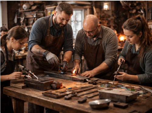 Impart pasiunea mestesugului cu copii si adulti in cadrul unor ateliere dedicate: fier forjat, turnatorie, acoperiri cu email, suflare sticla, realizare bijuterii.