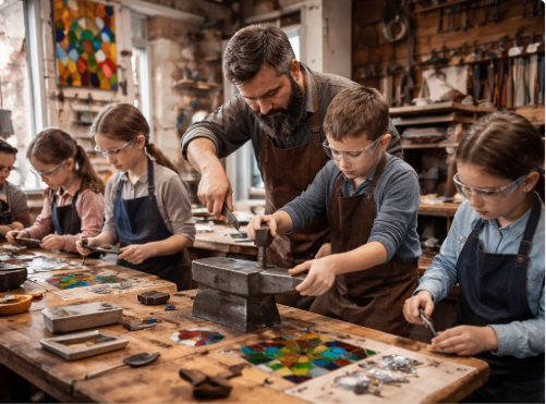 În atelier, lucrează cu metal și sticlă, învață prin experiență și pleacă acasă cu ceva făcut de ei.